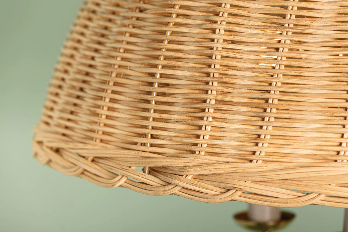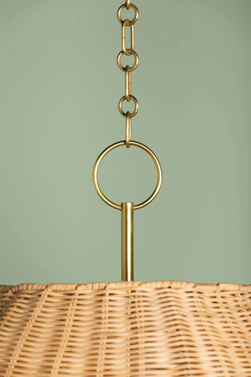 Arwen offers a playful twist on a classic half-dome chandelier. The candle array is shaded in natural rattan wicker, intricately woven to allow light to peak through. The effect is a fresh take on a traditional style, accented in sleek Aged Brass metalwork.