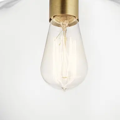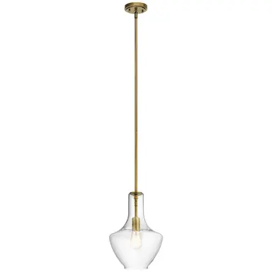 The Everly™ 15.25” one light bell shaped pendant comes with a curved, glass blown shade featuring clear glass and a Natural Brass® finish for a simple and elegant look. The Everly’s versatile design coordinates with a variety of styles and can be used singularly, in multiples or arranged at varying heights to elevate the room.