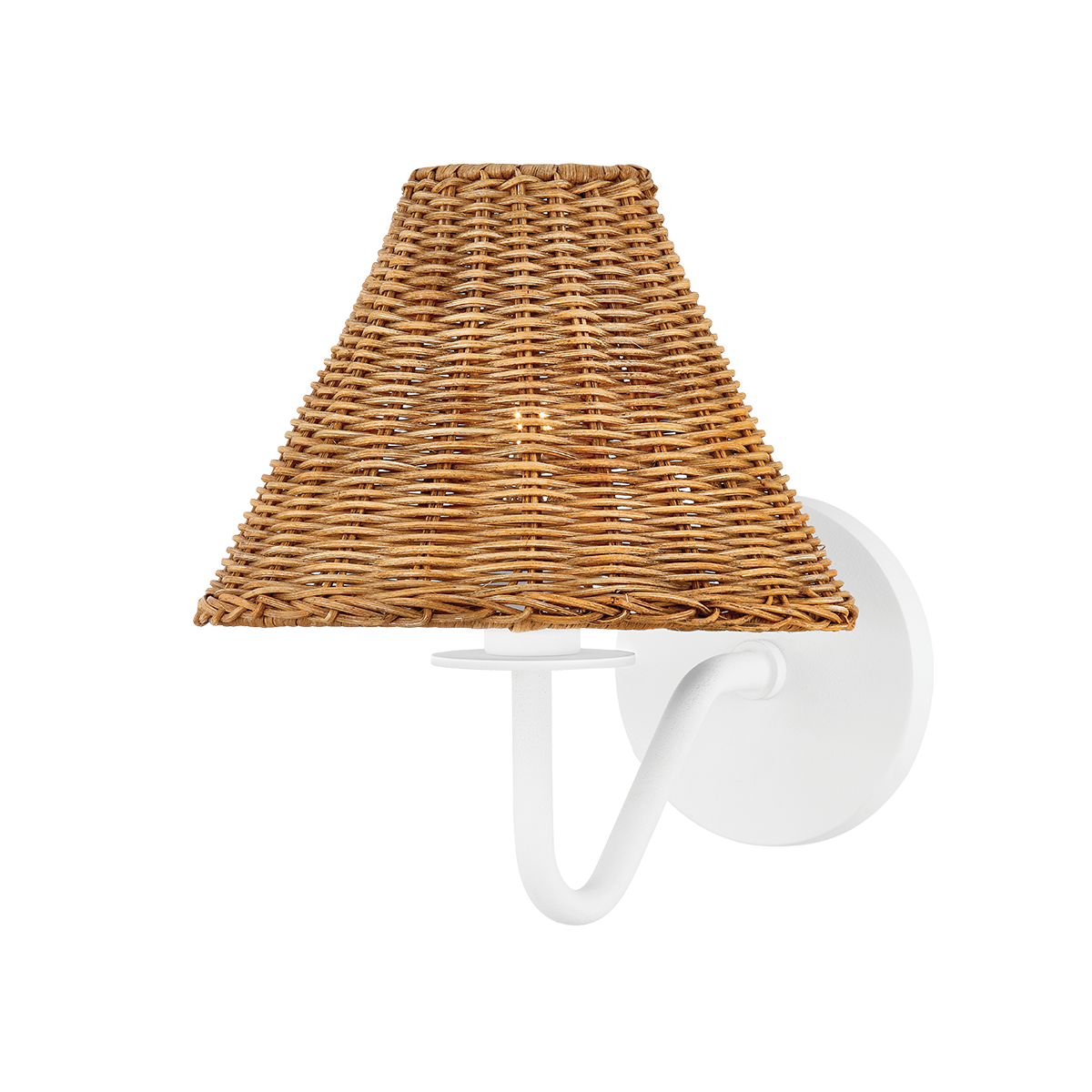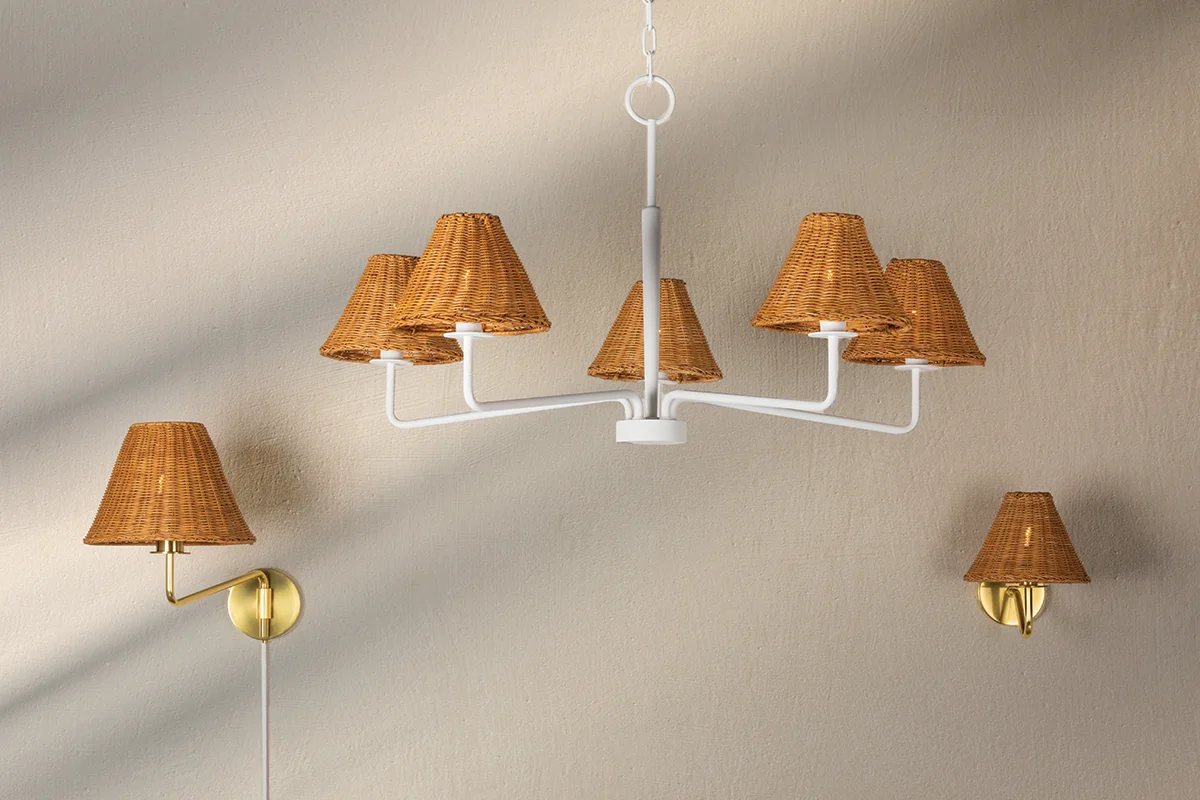 Issa has a natural style that’s ahead of the curve. Slender, hooked arms hold a woven rattan shade that lets a soft light filter through. The aged brass or textured white finish is the perfect complement to the natural shade and adds to the fixture’s overall earthy feel. Available as a chandelier, wall sconce or portable sconce, there’s a place for Issa in every space.