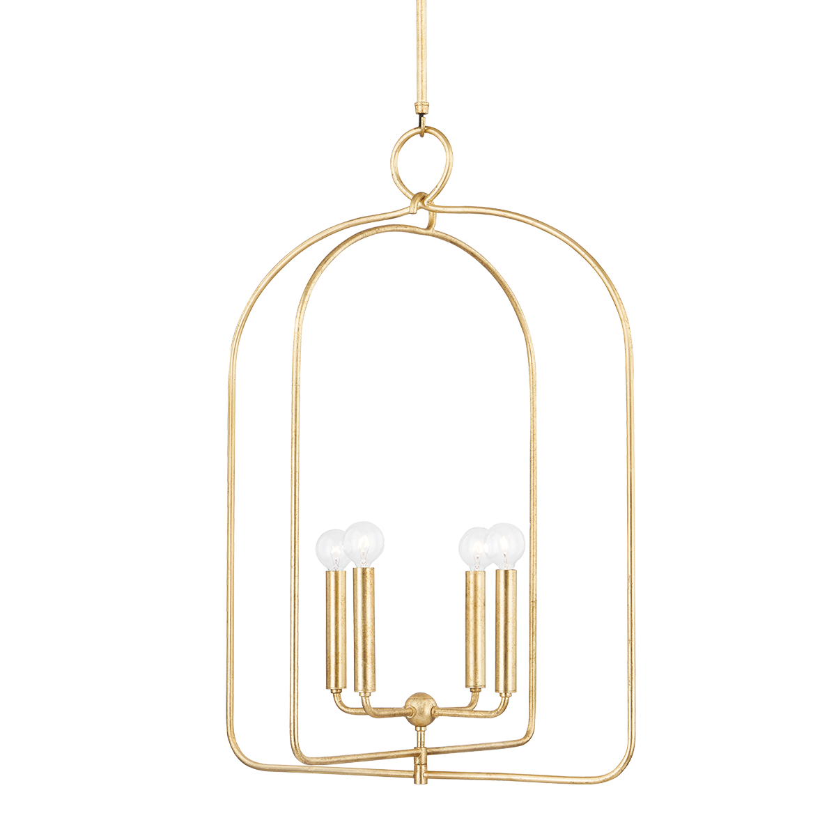 With its open, arched metal frame and gold leaf or aged iron finish, Mallory makes a stylish statement. Clear, round bulbs atop sleek, straight candle holders create a beautiful contrasting effect. Available as a sconce, pendant or linear, each fixture hangs from a round metal loop giving the piece a feeling of motion.